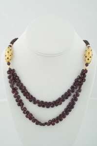 The rich look of two strands of faceted teardrop garnet briolettes, draping from Italian murano gold foil beads with garnet colored dots. The elegantly shaped murano beads are set between 14k gold beads and round faceted garnets. Measuring 19 inches across, with a 14k gold toggle clasp, this necklace looks rich and shapely.