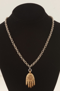 For those of you who value the healing power of touch, this Healing Hand made of hand carved bone from Indonesia will have special meaning. The chain, measuring 18 inches, is hand made, 98% pure fine silver from Thailand. It has a great heft and does look different from sterling silver. Closes with a large, sterling silver lobster clasp.
