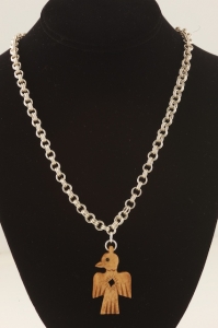 Very natural and spiritual NorthWest Indian bird made from hand carved bone from Indonesia. The chain, measuring 18 inches, is hand made silver from northern Thailand. Closes with a large sterling silver lobster clasp.