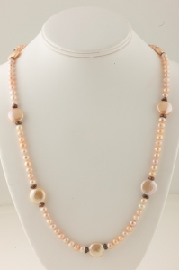 A long drape of freshwater peach pearls and peach coin pearls, with some little freshwater black pearls cupping the coin pearls. Love the color, and the overall look. The necklace measures 29 1/2 inches and closes with a 14k gold toggle clasp. Wear with suits, casual outfits or dress it up over a simple black dress. This long drape will work overtime!