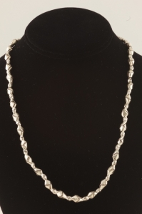 Very cool necklace of hand made Thai silver beads that have an origami-ish look and a great feel on. This necklace is 20 inches long and can be draped easily with the larger one, pictured, but also with lots of others. The necklace closes with a large sterling silver lobster clasp. Pick your own length and look.