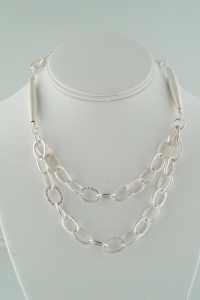 This necklace has a delicate and yet artful look. Made with Hilltribe silver from northern Thailand which is over 98% pure fine silver, it has a gloss which creates an attractiveness all its own. Highly versatile, very cool looking. Measuring 16 1/2 inches and closing with a large sterling silver clasp.