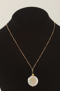The coin pearl in this necklace is exceptionally large. I buy them from a company in Florida and have yet to find any other supplier that can find the quality and the size consistently. These coins are just gorgeous. I have put in a lovely faceted round tourmaline on top of the solid gold piece for a bit of color. I have lots of colors of tourmaline. Let me know your favorite.