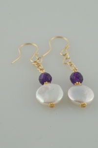 Beautiful white coin pearls, topped by high quality round faceted amethysts, dangling from 14k gold chain with a 14k gold earwire. Snazzy.