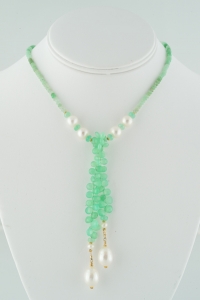 I love the color of chrysoprase! The green is so pure looking and reminds me of beautiful Asian art. This One of a Kind Harmony in excellent quality chrysoprase faceted rondelles, briolettes and large, high luster white freshwater pearls with 14k gold accents, is distinctive and beautiful. Will look great with light, fresh colors as well as darker ones, including black, grey and navy. You will want to wear it all the time.