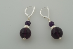 "Large faceted amethyst balls, large and small, with a sterling silver ball, on a sterling silver lever back."