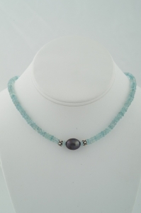 "Beautifully faceted large aquamarine rondelles highlighting a gorgeous large black freshwater pearl between sterling silver Bali style beads. Measuring 16 inches end to end, the necklace is finished with matching smaller pearls, Bali style silver and with a lovely twisted silver toggle clasp."
