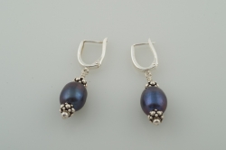 Large black freshwater pearl set between sterling silver Bali style beads. Sterling silver lever backs.