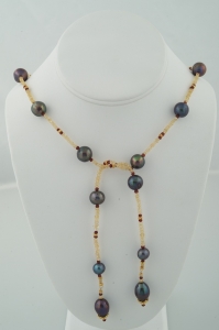"For a completely mesmerizing look, this Black Pearl, citrine, garnet and 14k solid gold Wrapp will meet the challenge. It will be noticed. Measuring 27 inches, end to end, with gorgeous, large, 10 – 12 mm black freshwater pearls and beautifully faceted rondelles, this Wrapp looks great wrapped just below your neck or anywhere else below."