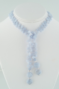 It's Spring! This One of a Kind Classic Wrapp in a very cool ice blue with light white threading through, is casual yet can be dressy. The blue lace faceted briolettes are finished with round faceted blue lace for a unified look. Sterling silver closures. Very attractive and versatile.