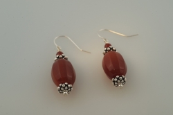 "A barrel shaped faceted carnelian in a deep, rich hue of burnt orange, symmetrically held between two sterling silver Bali style beads, and suspended on a sterling silver ear wire."