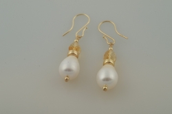 "Large white freshwater pearls sitting below beautiful micro-faceted citrine briolettes, accented with 14k gold, 14k gold earwires."
