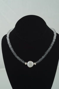 "This sparkling necklace of lovely faceted crystal rondelles combine with sterling silver pillows framing one very large white coin freshwater pearl. A simple, elegant look. "