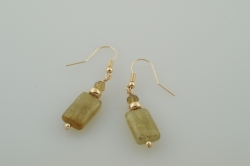 "Smooth rectangles of green garnet, complemented by 14k gold, swinging from a 14k gold coiled ear wire."
