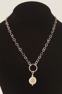 This necklace is really circular! Sterling silver chain of circles, with a big sterling circle holding a lovely freshwater white coin pearl. Very round. And yet....... this necklace looks really great on, classy and modern. Measures 16 inches, with a lobster clasp.
