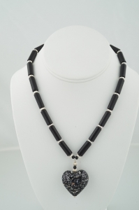 "One of a kind. Very modern, cool-looking take on hearts. Smooth cylinders of onyx between polished sterling silver . A puffy black and silver foil Murano heart (1 ¼ inch wide) looks shapely and artful. Closes with a sterling silver heart and toggle. Measures 17 inches."