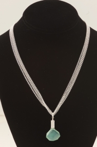 Pure loveliness with four strands of sterling silver chain and a large, faceted teardrop of milky green chalcedony. A great accent piece that can be layered or worn solo. The color, a mint green, will look great with almost anything but especially with the florals that are popular for summer. Wear day and night, also a great traveler you won't worry about at this price. (Although it looks much more expensive) Measures 16 inches and closes with a sterling silver lobster clasp.