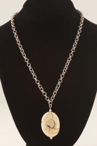 A very cool and versatile look for casual days. The chain is hand stamped, hand made Thai silver and the shell is calcified from Nepal - no two alike, of course. The chain in this look is 28 inches long, the shell measures about 1 1/2 inches top to bottom. Closes with a very large sterling silver lobster clasp. Fun, with great layering possibilities.