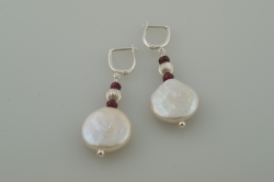 "Large, luscious white coin freshwater pearls, complemented with sterling silver and garnet. Sterling silver lever back."