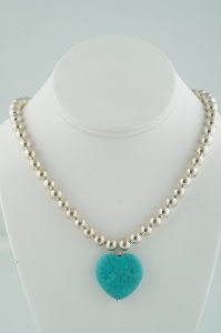 A sharp looking necklace of sterling silver balls with a dangling turquoise heart. Measuring 18 inches in length and closing with an elegant, heavy sterling silver twisted "S", this necklace is a perfect complement for just about anything in your wardrobe!