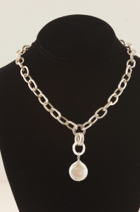 The Coin Drop design in beautiful Thai silver smooth oval link chain and a very large freshwater white coin pearl. Easy to wear with most of your wardrobe - dresses up or down. Pictured here, the necklace is 17 inches across and closes with a very large sterling silver lobster clasp.