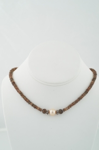 "A shimmering necklace with brown, orange, red and gold hues, depending on the light. Faceted andulusite rondelles surrounding a large, high luster peach freshwater pearl, in turn held by sterling silver Bali style beads. The necklace is finished with smaller matching Bali style beads and a sterling silver toggle clasp."