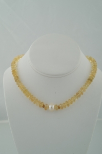 "Make a major statement with this Citrine Ace. Very large, beautifully faceted citrine rondelles framing a high luster, very large, 10 – 12 mm white freshwater pearl, nestled between 14k solid gold Bali style beads. The necklace is finished with matching smaller pearls, 14k gold Bali style beads and a 14k gold toggle clasp. "