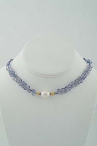 "The quiet beauty of this necklace makes it an excellent choice for your more elegant suits and dresses. The beautifully faceted iolite briolettes in a periwinkle tone surround a lovely large, white freshwater pearl solitaire, set between 14k solid gold Bali style beads. The necklace is finished with matching smaller white pearls, 18k gold daisy spacers and a 14k gold toggle clasp."