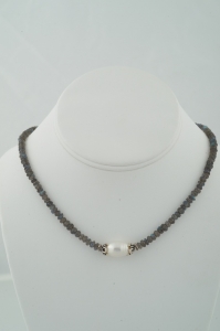"Excellent quality faceted Labradorite rondelles spotlighting a high luster, large white freshwater pearl, clutched by sterling silver caps. A great everyday piece. Measuring 16 inches end to end, it closes with an artful twisted sterling silver toggle clasp."