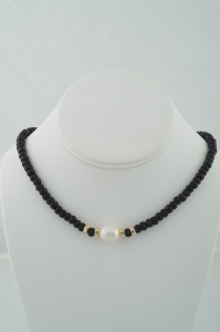 "Very cool in large faceted onyx rondelles, converging on the centerpiece of gold, onyx and one very large, high luster white freshwater pearl. Finished with 14k gold toggle clasp. Understated."