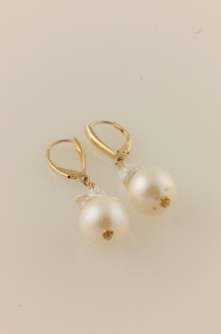 Very adorable dangles of beautiful quality, large freshwater white pearls, solid 14k gold and little faceted crystal balls. Modern, artful, sophisticated.