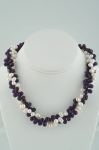 A lovely, summer choker of high quality faceted amethyst briolettes twisting with a strand of white freshwater pearls for a fresh, modern look. Closing with a sterling silver clasp.