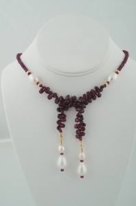 "The Garnet and gold Harmony measures 24 inches end to end. It has high quality faceted garnet rondelles around the neck leading to a large single white freshwater pearl of 10 –12 mm, set off by 14k gold spacers. Next come gorgeous faceted teardrop briolettes, followed by the finish of 14k gold beads holding large white pearls at the bottom, with garnet flourishes. Elegant."
