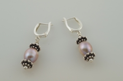 "Lovely pink freshwater pearl surrounded by Bali style sterling silver, hanging from a thick sterling silver lever back. Looks elegant."