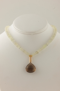 This is one of my favorites. I love the heishi cut prehnite faceted slices coupled with the faceted tear drop of smokey quartz. Accents of 14k gold. It just looks so cool. Love the color combo, the neatness of the look, the modern feel. Measures 15 1/2 inches across and closes with a 14k gold toggle clasp. Feels great on.