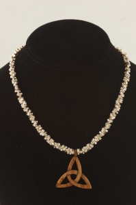 This is one of my personal favorites, because I think the hand stamped links look very elemental and they feel great on. The Celtic Knot is hand carved bone from Indonesia and the links, which are strung together into an 18 inch chain, are each individually hand made and hand stamped by a tribe in northern Thailand. Closes with a large, sterling silver lobster clasp.