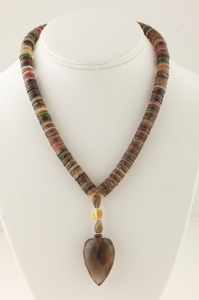 These very large, high quality, heishi cut faceted tourmaline slices came in a shipment unrequested. They are beautiful, colorful and quite large. The faceted smokey quartz drop is the perfect balance. This necklace looks absolutely fantastic on and does not feel heavy. It measures 17 inches across, is accented with solid 14k gold and closes with a 14k gold toggle clasp. This fabulous and highly versatile piece is for a strong, confident woman.